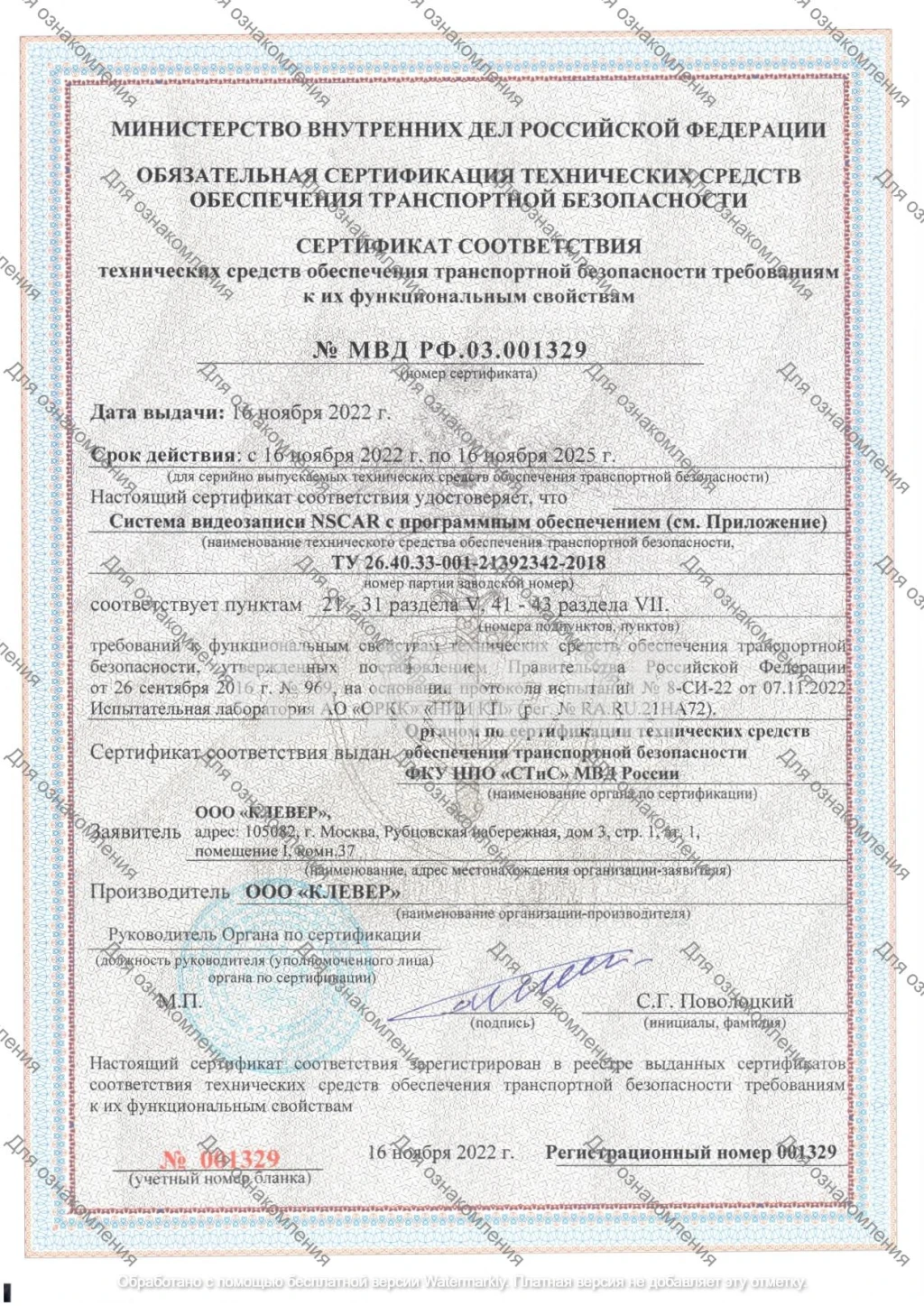 • Сертификат ФКУ НПО "СТиС" МВД России.